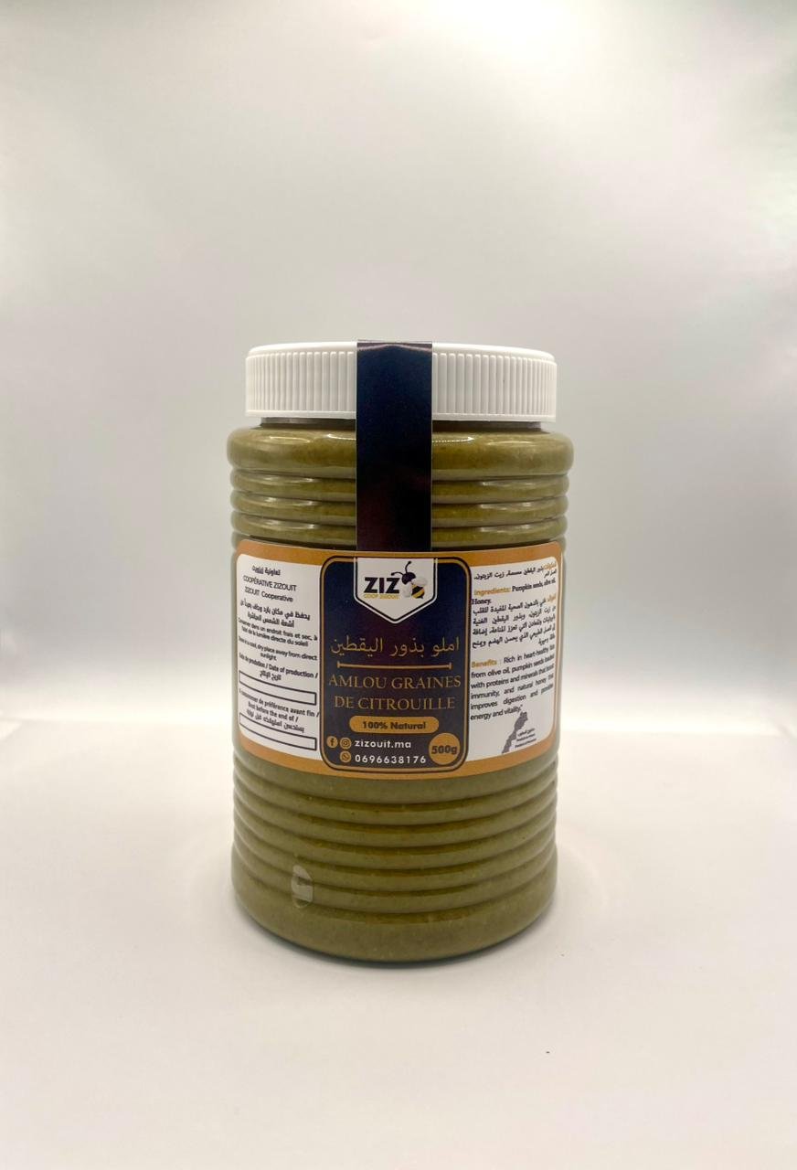 L’amlou Zizouit est une recette innovante qui mélange des graines de courge riches en nutriments, du miel pur et de l’huile d’olive vierge. Un mélange naturel de haute qualité, au goût délicieux et à la texture crémeuse, idéal pour un mode de vie sain et équilibré.
